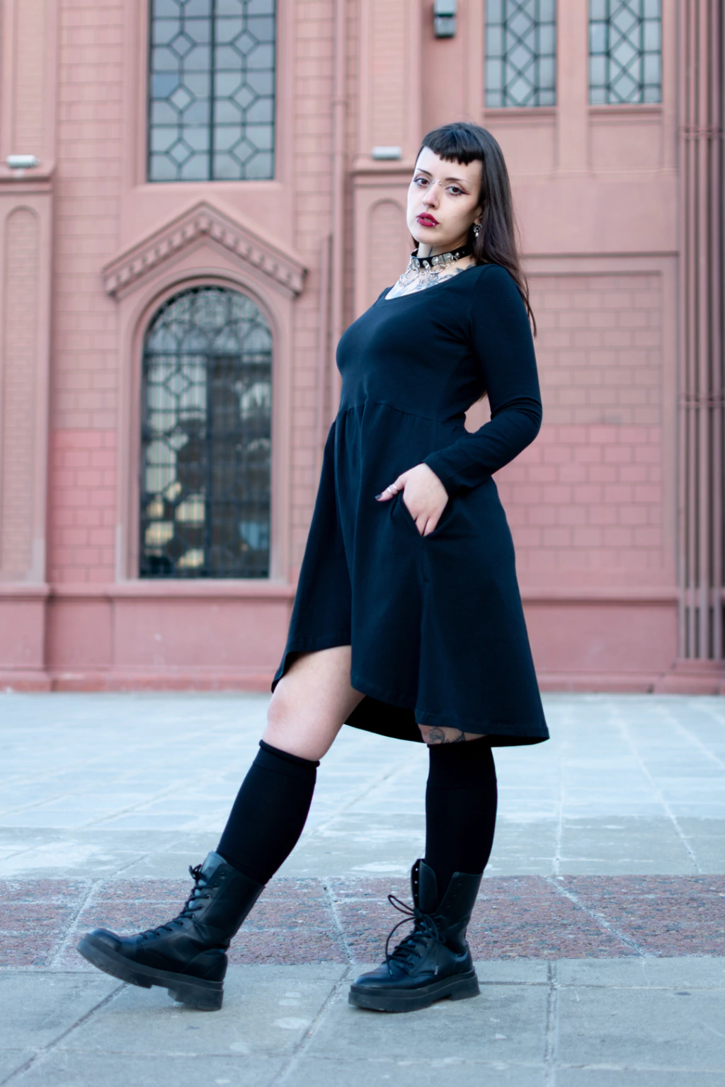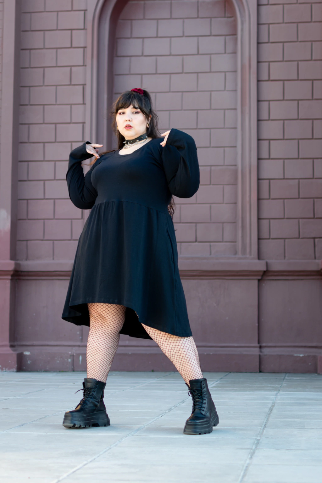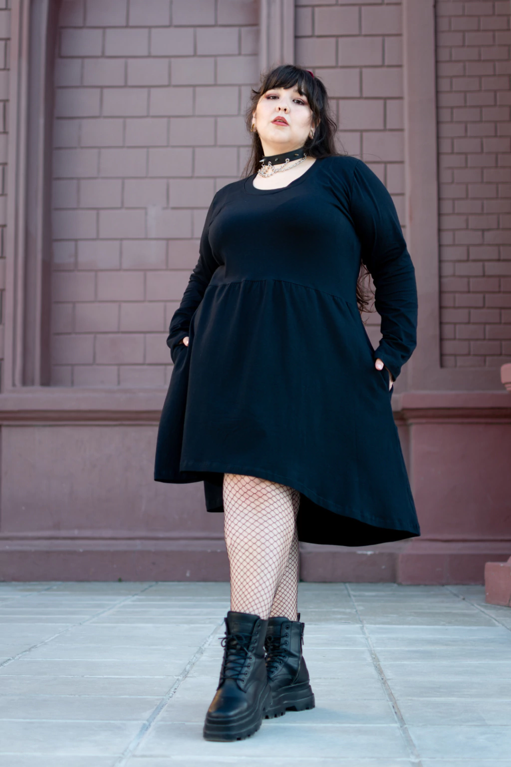 Vestido corto, con corte en la cintura, falda con vuelo, color negro, manga larga. Es irregular y tiene bolsillos.