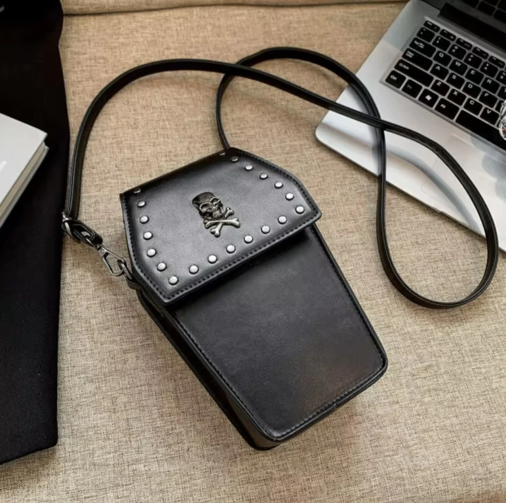 Cartera con forma de ataúd, con tapita, con aplique metálico de calavera en el frente y tira larga desmontable.