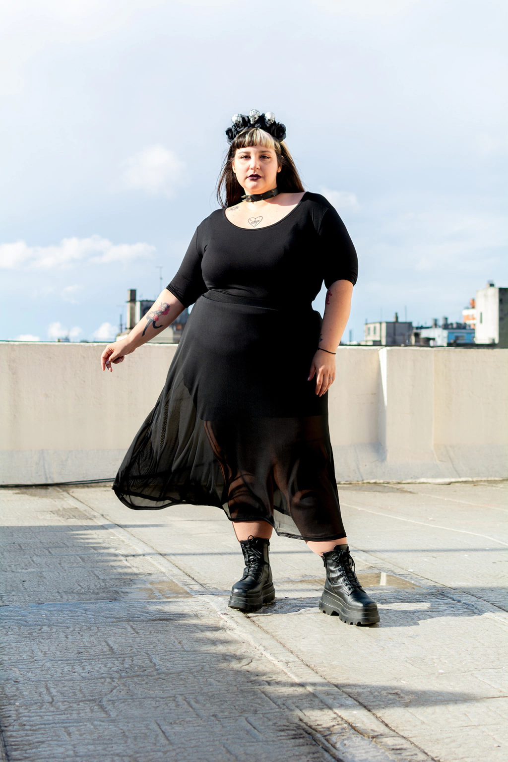 Pollera largo midi de microtul negro elastizado, con elástico en la cintura y falda corta negra abajo, haciendo de forrería.