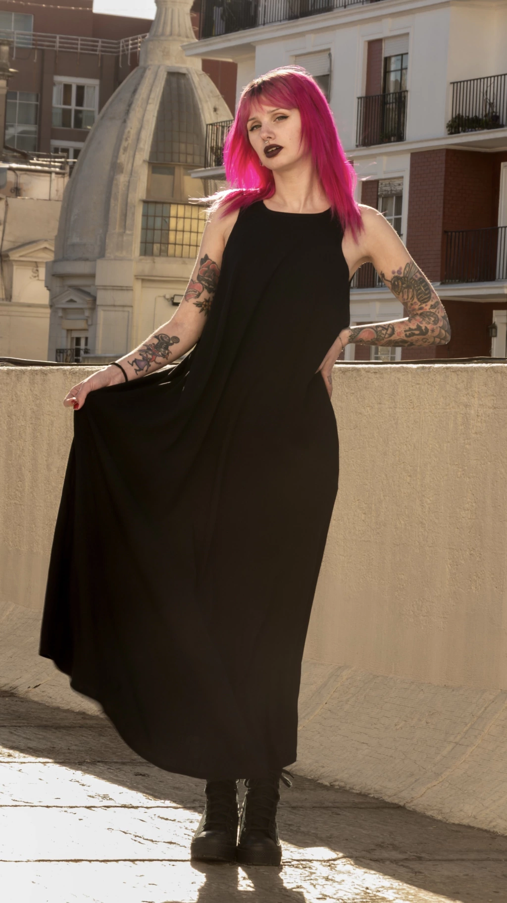 Vestido negro largo, evasé, de rayón viscosa, con escote cerrado y bolsillos.